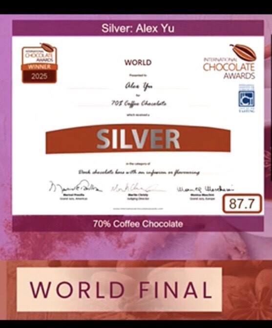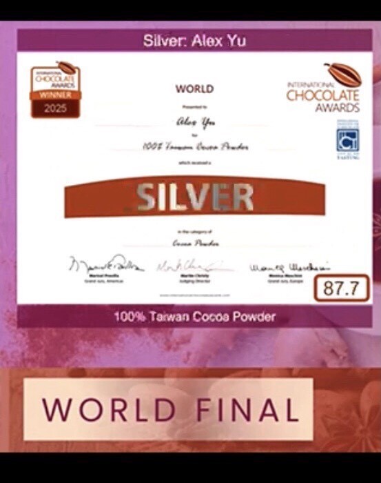以台灣可可勇奪2025世界巧克力大獎銀牌 — 以教學、研發與在地可可為核心,展現「從產地到巧克力」的國際競爭力 —2025年國際巧克力大獎(International Chocolate Awards, ICA)世界總決賽結果揭曉,來自台灣屏東的巧克力職人-喻天福 老師再次以屏東在地可可為核心原料,榮獲世界銀牌兩面,分別是〈70% Taiwan Coffee Chocolate〉與〈100% Taiwan Cocoa Powder〉。