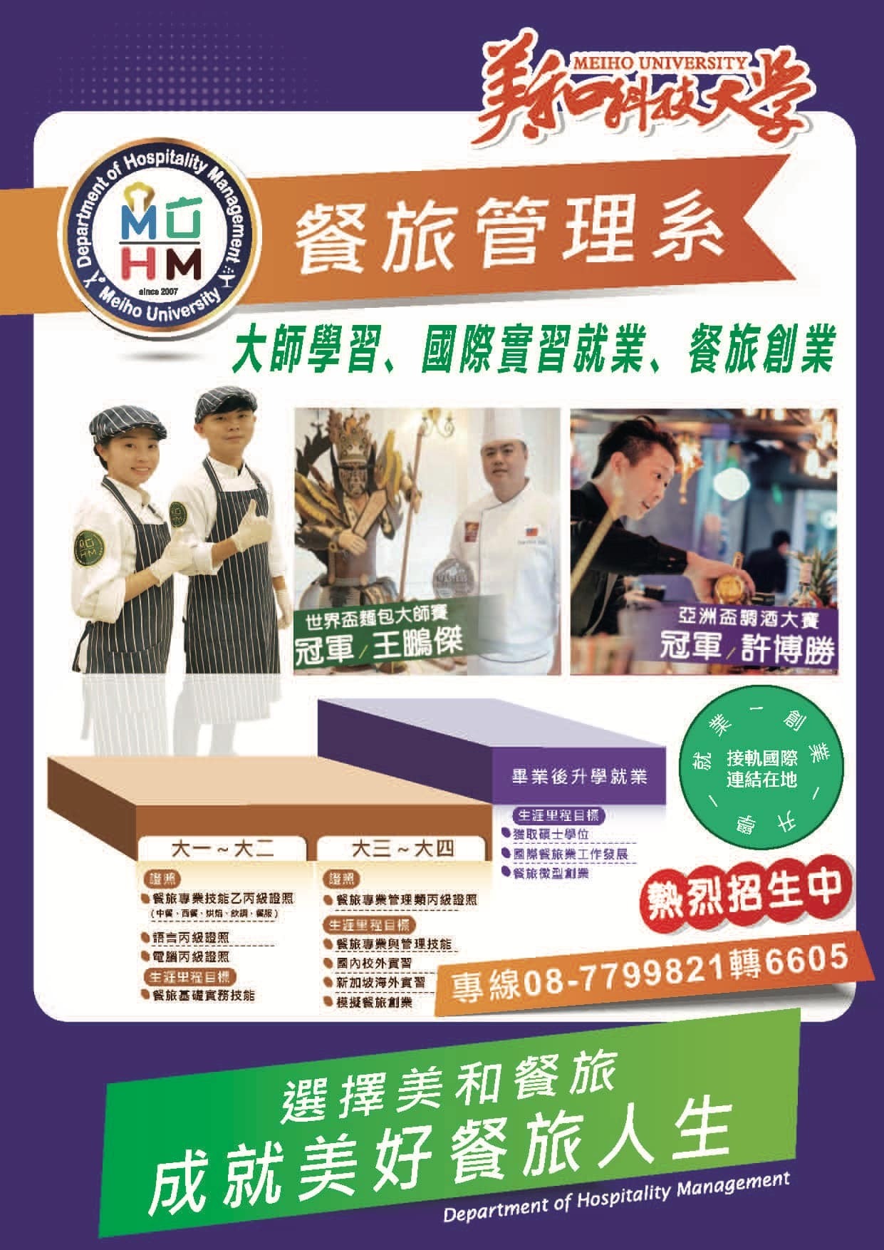 本系報名學制:日間部五專、日間部二技、日間部四技。歡迎就讀本系的同學請詳讀簡章內容,速把握時間完成報名手續, 如有疑問可電洽: (08)7799821- 6613/ 6601。